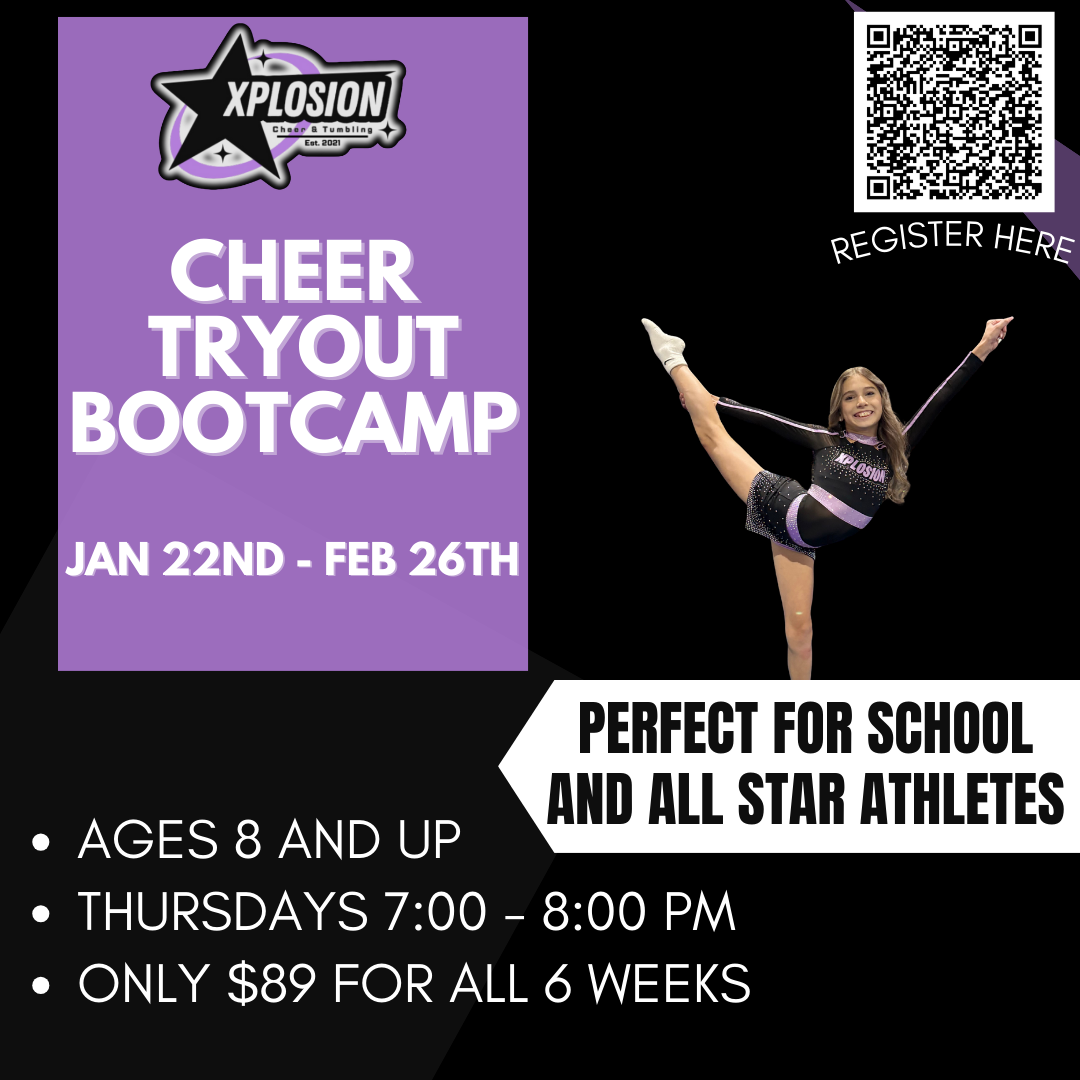 Cheer Boot Camp is a focused 6-week training program designed to prepare athletes for middle school, high school, and All Star cheer tryouts. Athletes will build strong foundations in motions, jumps, cheers, stunting technique, and overall confidence. This program is perfect for anyone wanting to level up their skills, improve their strength and endurance, and walk into tryouts feeling prepared and encouraged. All experience levels are welcome! The session will begin on Thursday, January 22nd, and continue for the following 6 weeks.