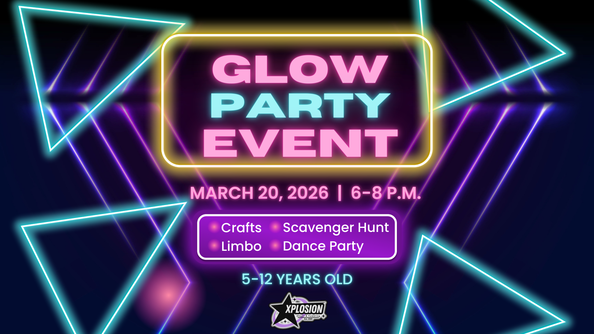 Let's GLOW crazy at Xplosion on March 20, from 6-8 p.m.! This is the perfect event for ages 5 to 12 years - wear your neon colors and come ready to dance! We will teach some of your favorite TikTok Dances, have glow in the dark face paint and a glow dance party your child...